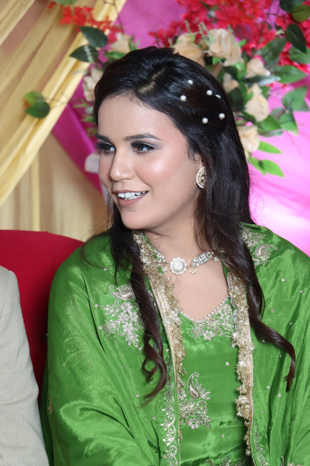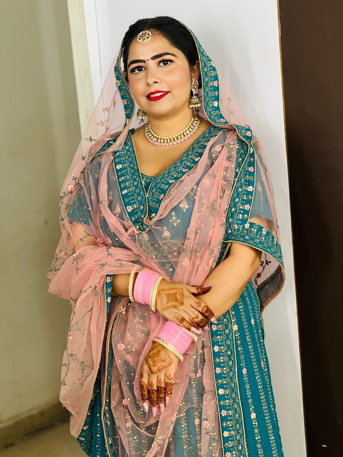 Goes beautifully with light-colored dresses or lehengas. Subtle shimmer and rosy tones give a dreamy, fresh appearance.